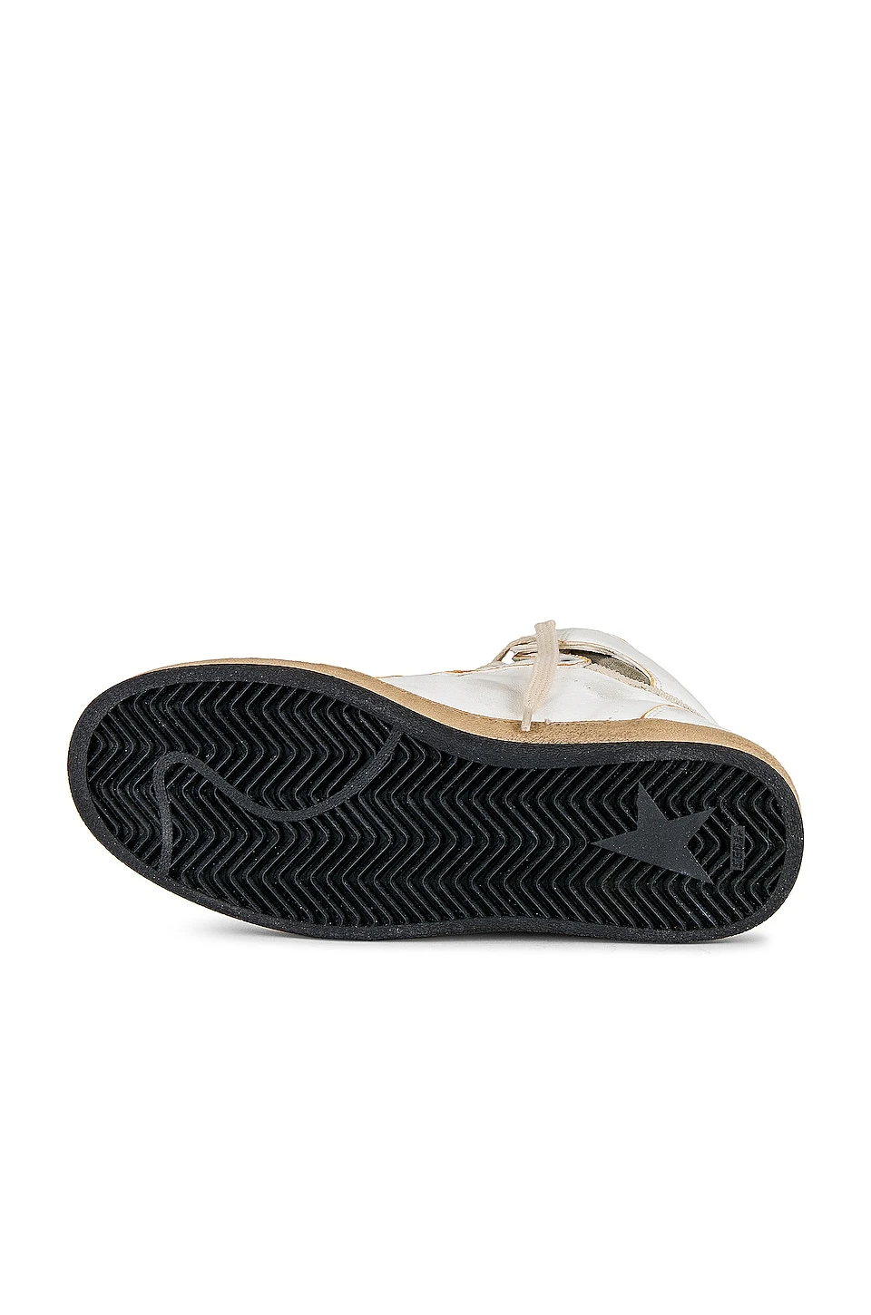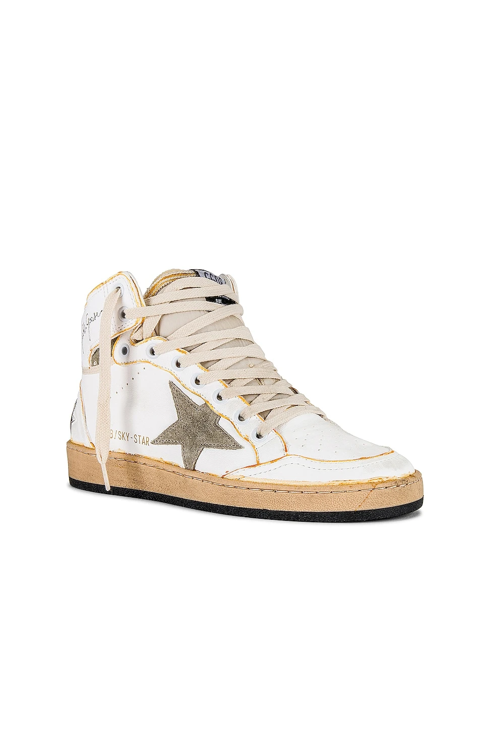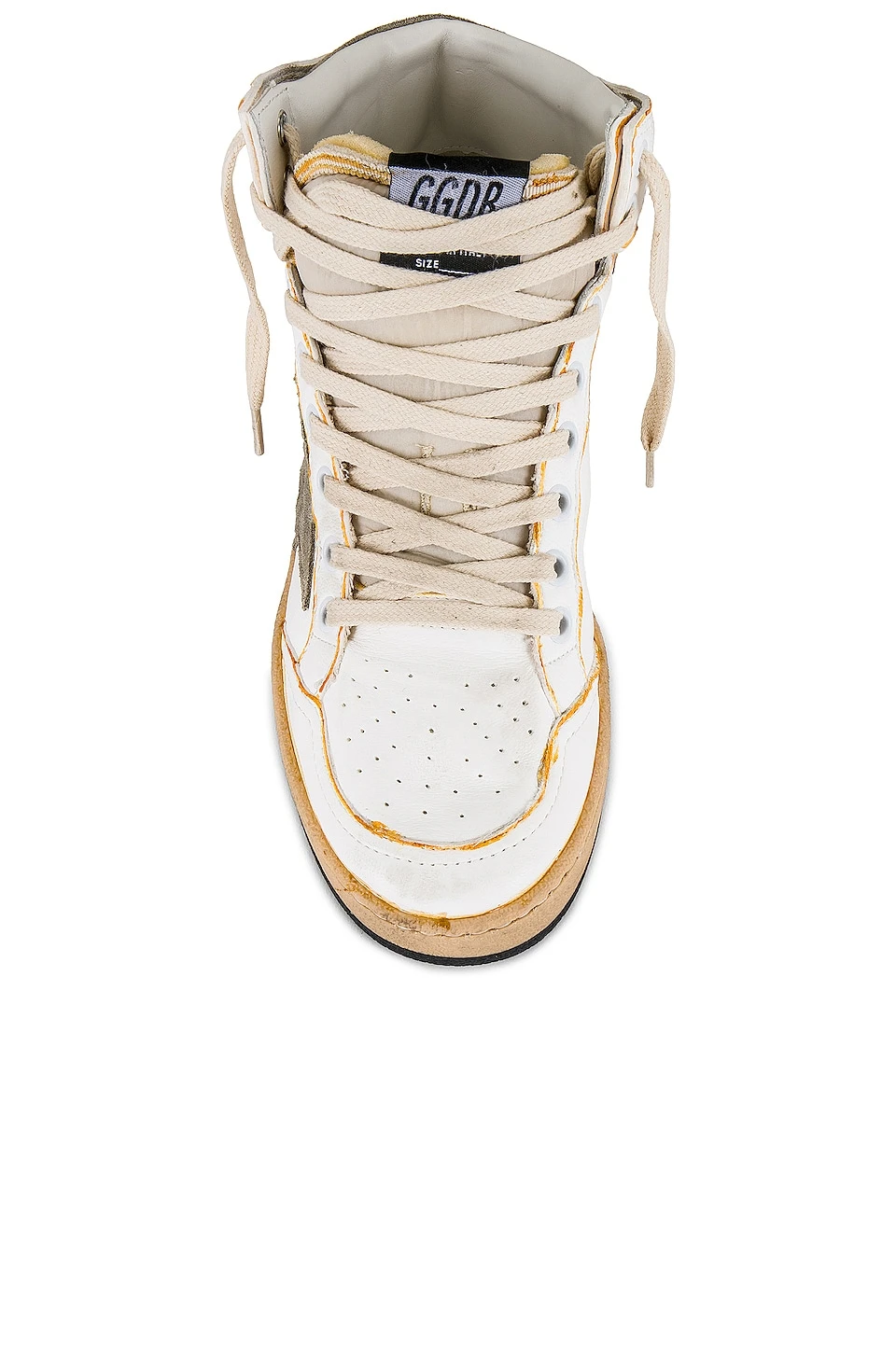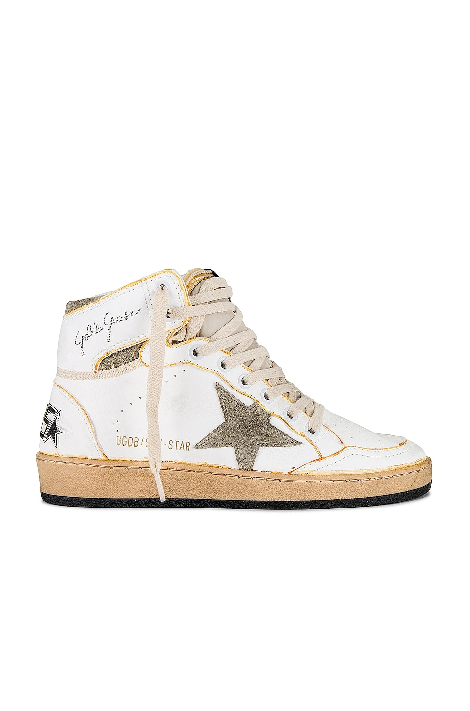 - Gold logo stamp and Golden Goose signature at side