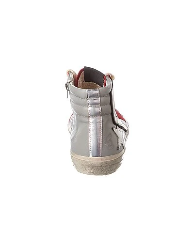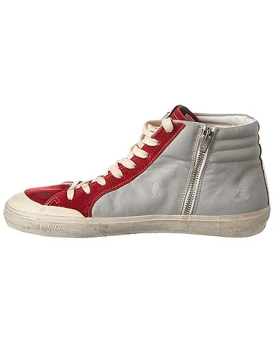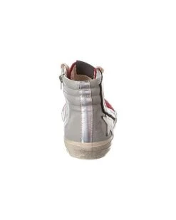 - Slide Penstar Leather Sneaker in grey and red leather and silver-tone hardware with distressed design and zipper accent