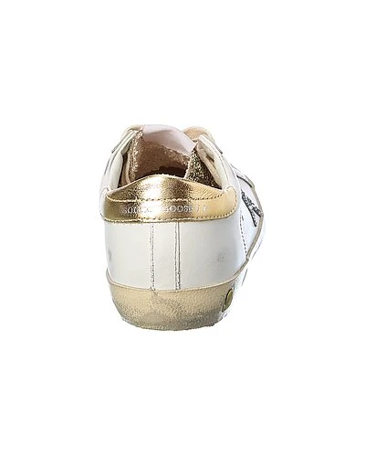 - Superstar Glitter & Leather Sneaker in white and gold leather and silver glitter with distressed design