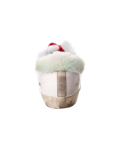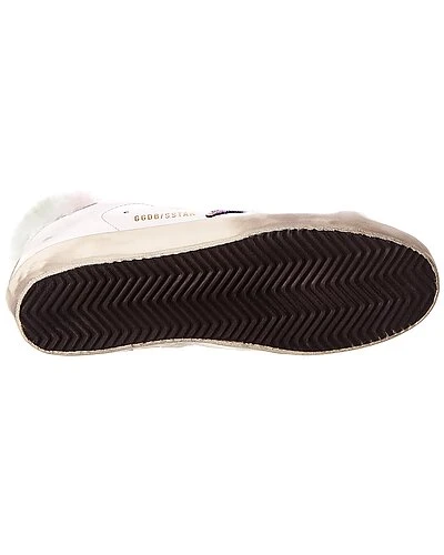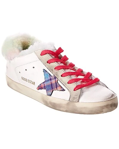 - Superstar Leather & Shearling Sneaker in white leather and rainbow shearling with distressed design and printed star accent