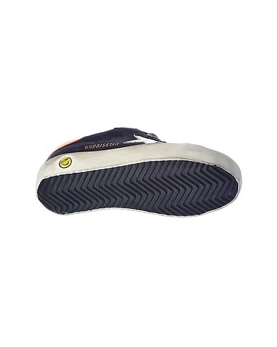 - Superstar Suede & Leather Sneaker in navy suede and orange leather with distressed design and printed laces